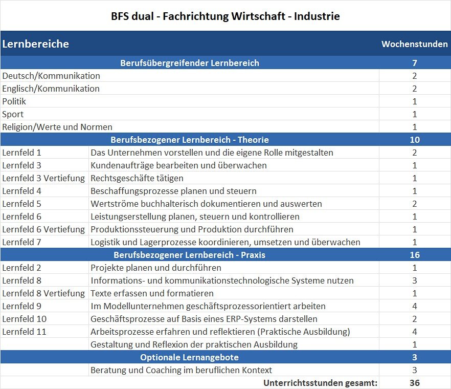 Das Ziel der Berufsfachschule dual – Fachrichtung Wirtschaft – Schwerpunkt Industrie ist es, Kompetenzen und Fertigkeiten zu vermitteln, die es ermöglichen, in eine kaufmännische Ausbildung in der Industrie einzutreten oder sich schulisch im Bereich Wirtschaft weiter zu qualifizieren. Durch einen hohen Praxisanteil wird eine fundierte berufliche Orientierung gewährleistet und die individuelle Entwicklung durch Beratung und Coaching gezielt unterstützt.