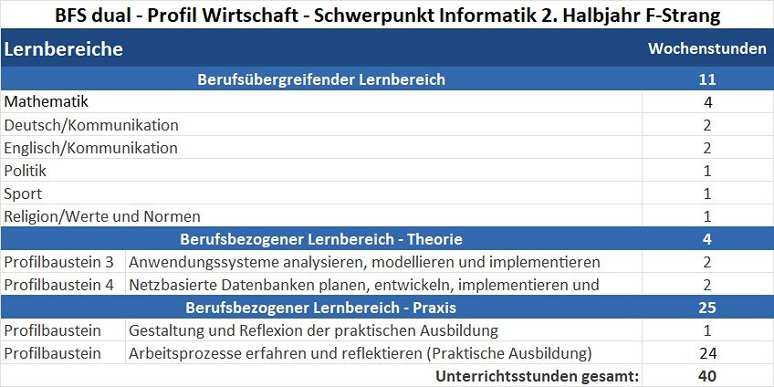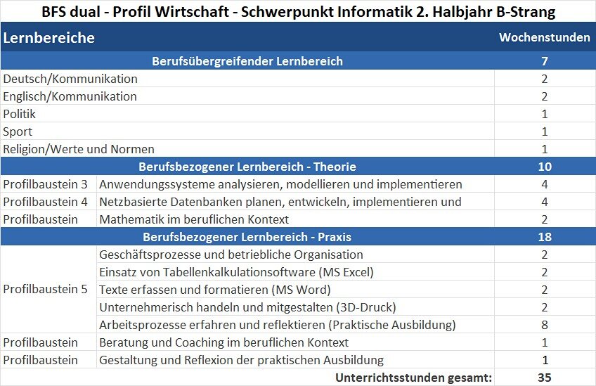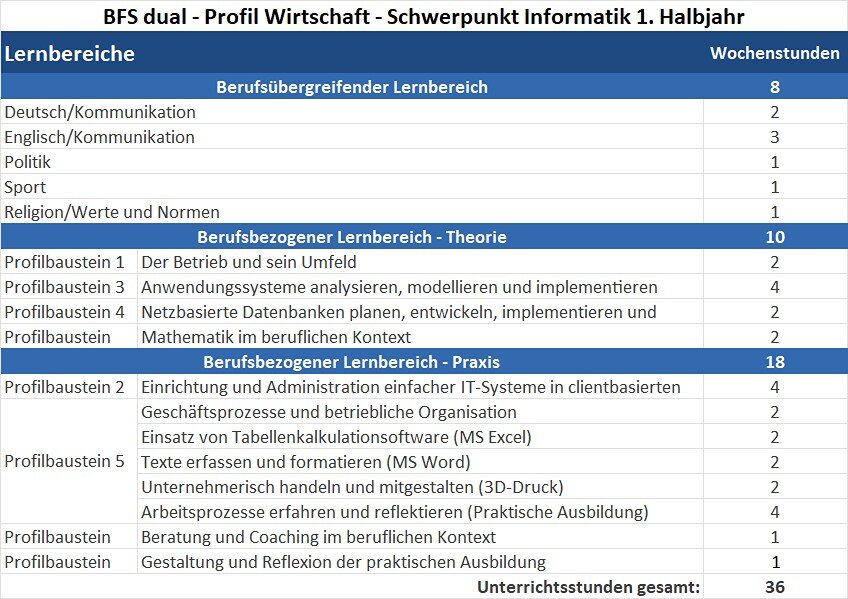 Das Ziel der Berufsfachschule dual – Profil Wirtschaft – Schwerpunkt Informatik ist es, Kompetenzen und Fertigkeiten zu vermitteln, die es ermöglichen, in eine IT-Ausbildung einzutreten oder sich schulisch im Bereich Wirtschaft/Informatik weiter zu qualifizieren. Die Unterrichtsinhalte gliedern sich in die Vermittlung einer erweiterten Allgemeinbildung der Schülerinnen und Schüler sowie in die Auseinandersetzung mit fachtheoretischen und fachpraktischen Inhalten im Bereich IT-Dienstleistungen.