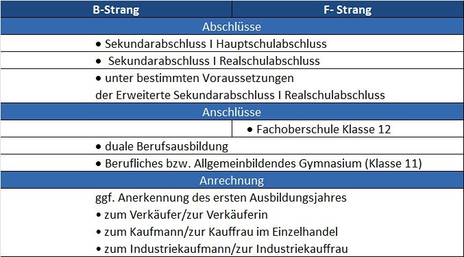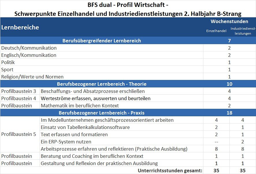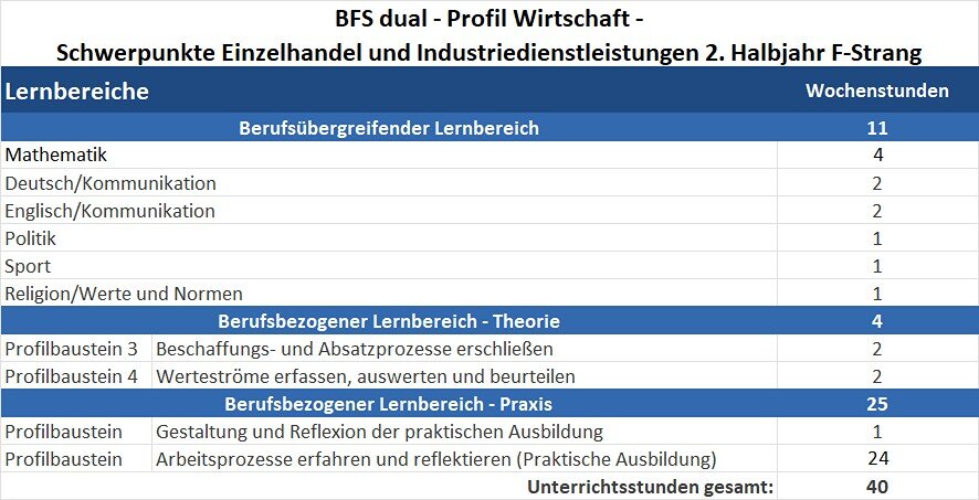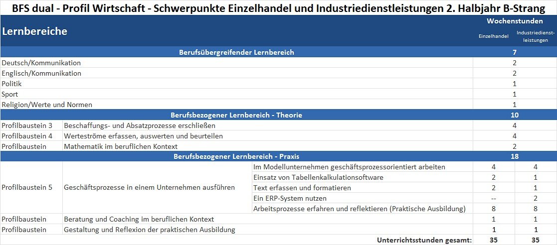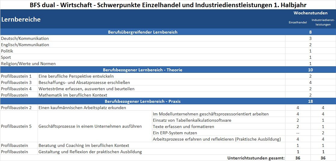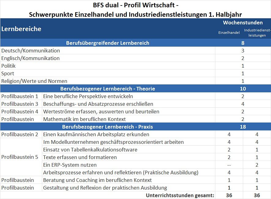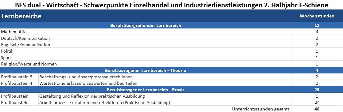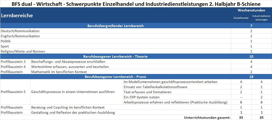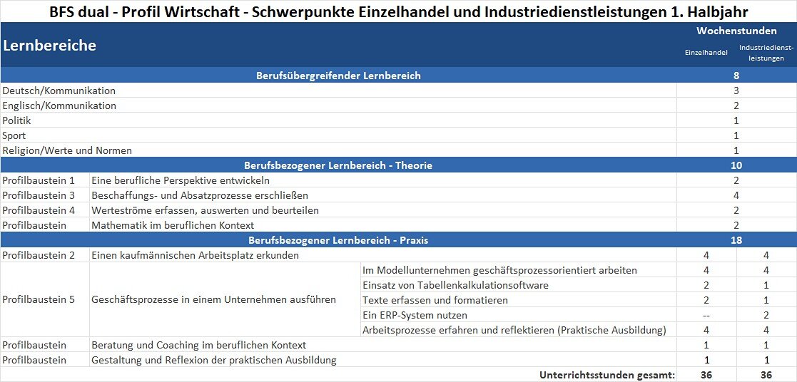Das Ziel der Berufsfachschule dual – Profil Wirtschaft – der Schwerpunkte Einzelhandel und Industriedienstleistungen ist es, Kompetenzen und Fertigkeiten zu vermitteln, die es ermöglichen, in eine kaufmännische Ausbildung einzutreten oder sich schulisch im Bereich Wirtschaft weiter zu qualifizieren. Durch einen hohen Praxisanteil wird eine fundierte berufliche Orientierung gewährleistet und die individuelle Entwicklung durch Beratung und Coaching gezielt unterstützt.