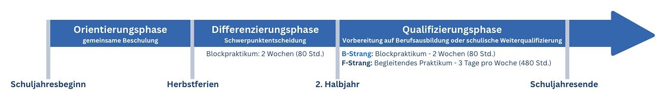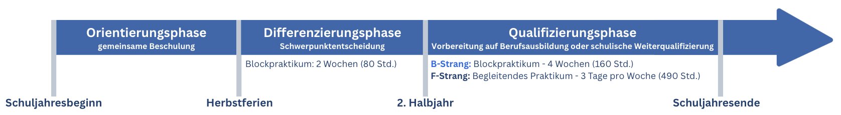 Die erste Phase der praktischen Ausbildung findet im jeweiligen Schuljahr in der Zeit nach den Herbstferien statt. Das Blockpraktikum im B-Strang wird unmittelbar nach dem Halbjahreszeugnis durchgeführt.