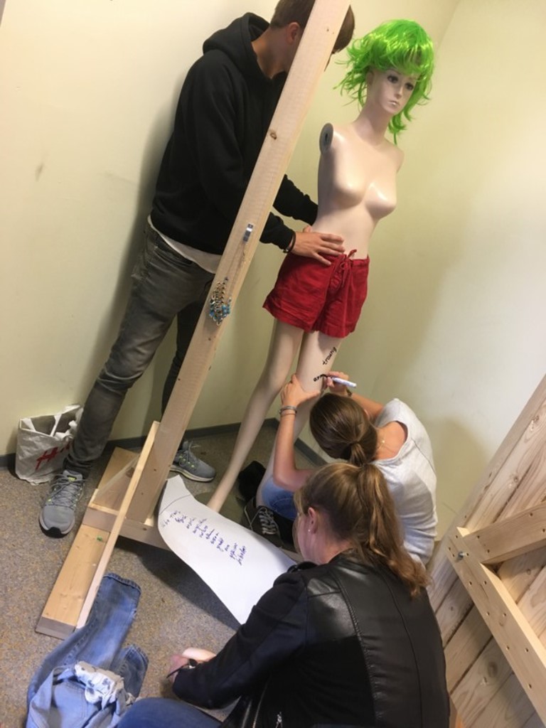 Des Weiteren wurde eine ungewöhnlich bekleidete Puppe mit grünen Haaren in die Tür gestellt, um Toleranz und Vielfalt darzustellen. Sie und die offen stehende Tür symbolisieren die Offenheit unserer Schule gegenüber allen Menschen.
