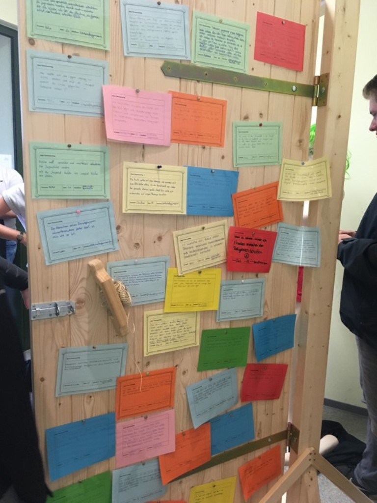 Die Jahrgänge 11 und 13 des Wirtschaftsgymnasiums formulierten Thesen, die an die Tür geschlagen wurden. Zu den Fragestellungen „Was muss sich aus unserer Sicht in Kirche und Gesellschaft ändern?“ oder „Wo ist heute Reformbedarf?“, wurden z. B. folgende Thesen angeschlagen: