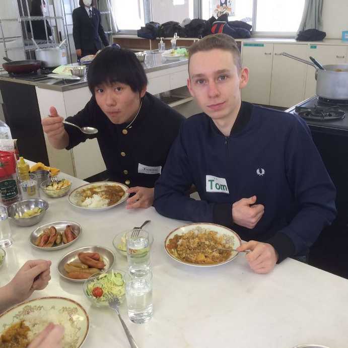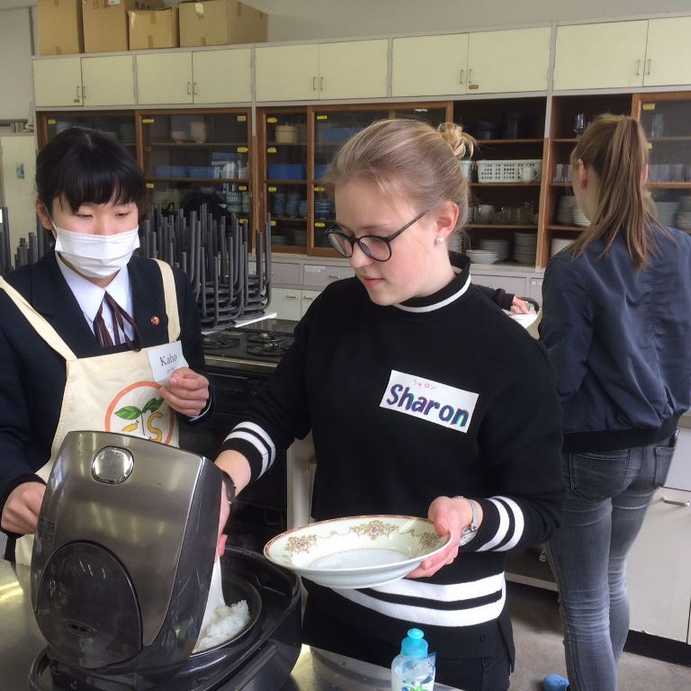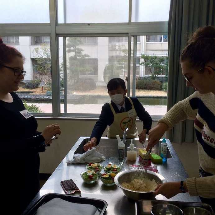 Wieder zurück in der Schule, kochten japanische und deutsche Schülerinnen und Schüler zusammen. Es wurde ein Reis-Currygericht gekocht, Salat und Hot Dogs gemacht sowie Cookies gebacken. Dabei hatten alle viel Spaß. Sprachbarrieren gab es auch bei dieser Aktion nicht. Natürlich wurde im Anschluss gemeinsam gegessen und auch gemeinsam abgewaschen und aufgeräumt. Kochen ist an der TCHS ein Pflichtfach.