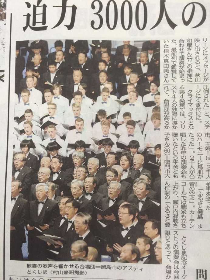 Im Anschluss folgte das Konzert des Tokushima Kinen Orchestra unter Leitung von Kazuyoshi Akiyama. Im 4. Satz wurde von den Solisten und allen 3012 Sängern die Ode an die Freude gesungen.