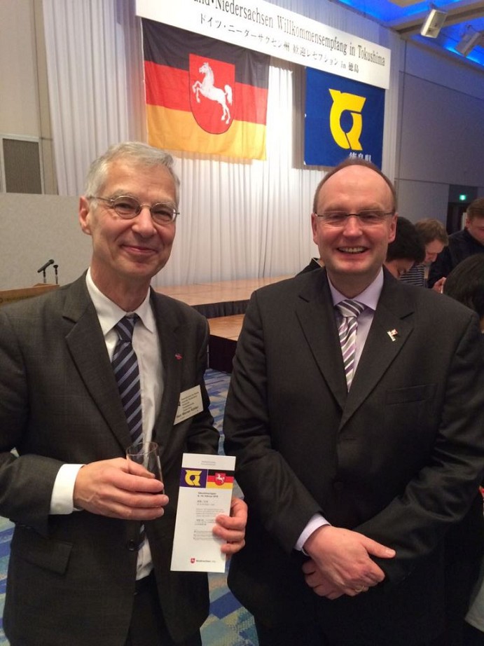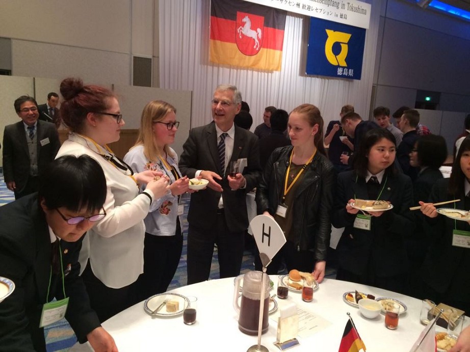 Der Tag war bis dahin schon ereignisreich. Der Höhepunkt des Tages war allerdings der Empfang der Präfektur Tokushima für die niedersächsische Delegation. Eingeladen waren alle Schülerinnen und Schüler aus Niedersachsen und die Schülerinnen und Schüler aus den japanischen Partnerschulen, die ebenfalls am Konzert teilnehmen. Dazu kamen noch Lehrer, Schulleitungen, die Vertreter des Niedersächsischen Kultusministeriums unter Leitung von Frau Schröder, weitere Vertreter sowie der Gouverneur der Provinz Tokushima, Herr Iizumi, und der deutsche Generalkonsul, Herr Doktor Köhler.