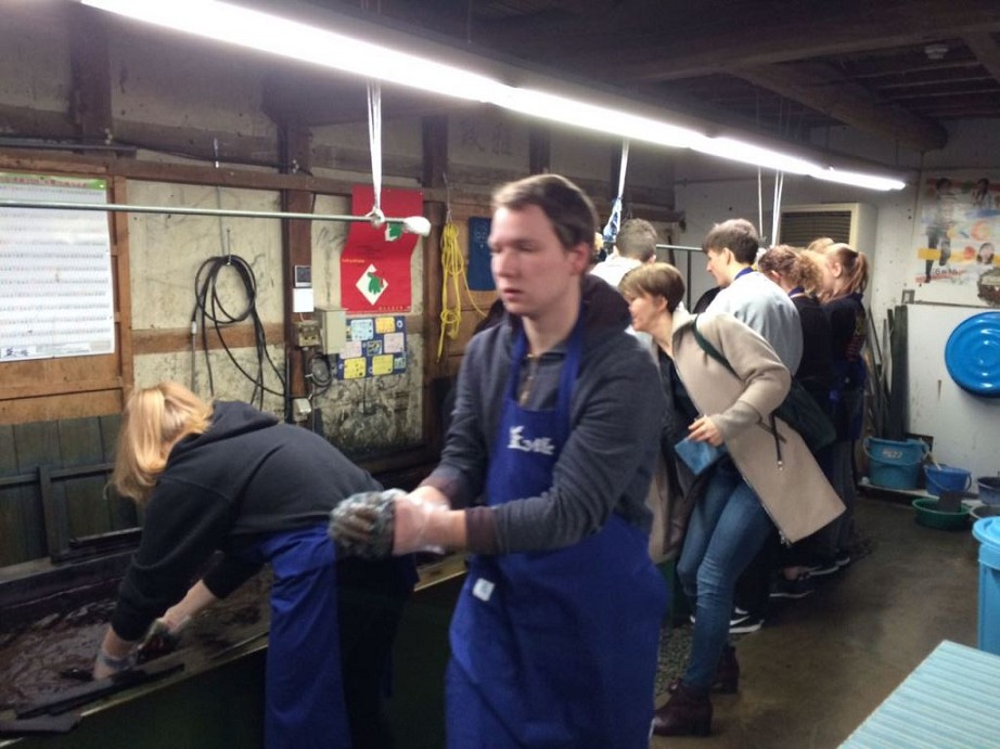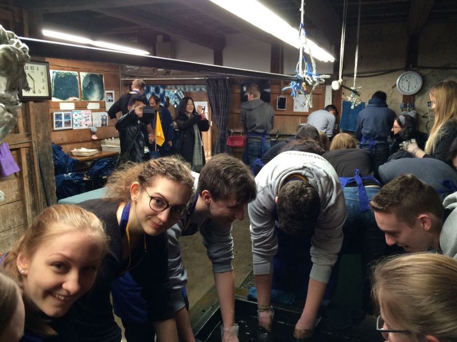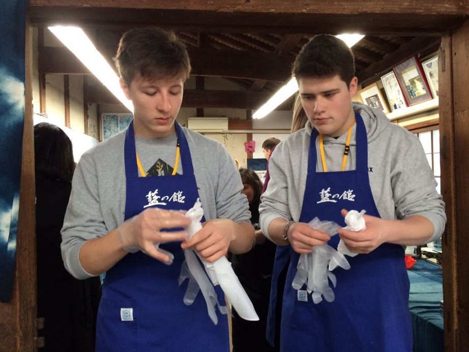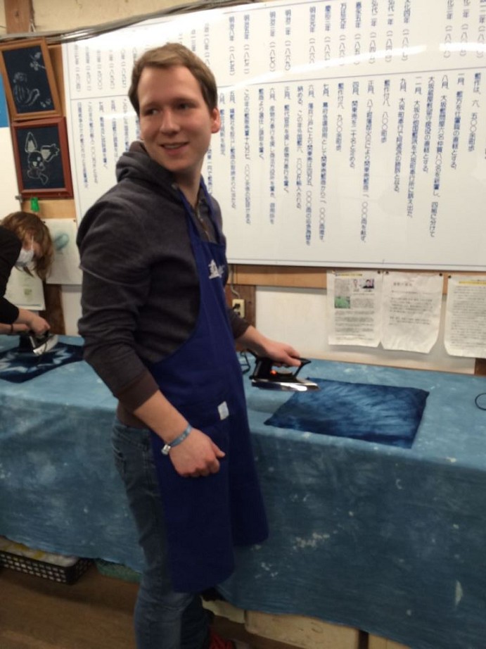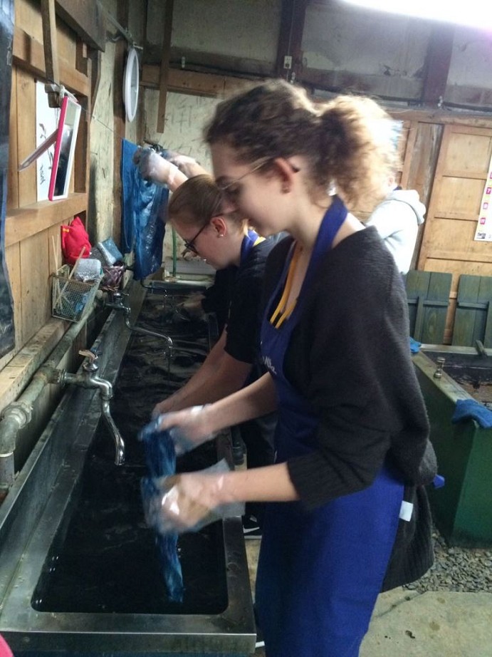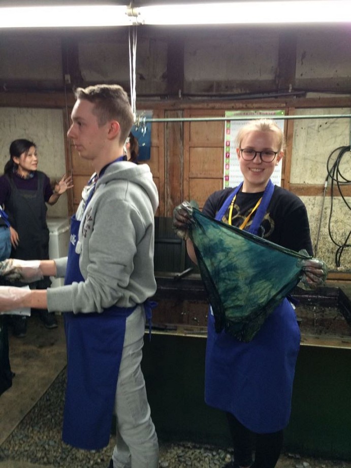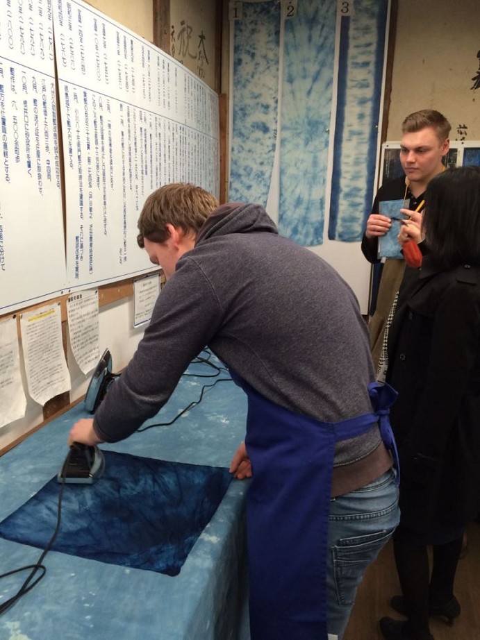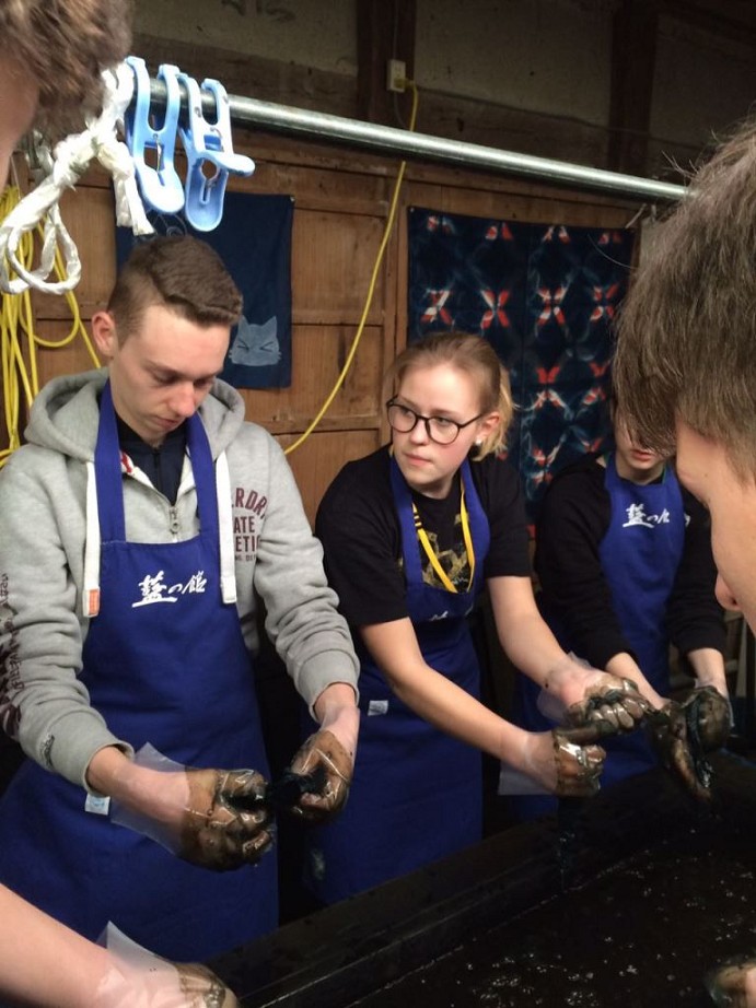 Nachdem wir um 7:40 Uhr Frühstück hatten, fuhr unsere Gruppe zu einer Indigo-Färberei. Dort werden aus Indigopflanzen blaue Farbstoffe gewonnen, die zum Färben und Herstellen von bedruckten Stoffen genutzt werden. Die Technik ist ähnlich wie die – vorrangig in Norddeutschland – bekannte Drucktechnik. Vor zwei Jahren waren sogar einige Blaudrucker (ja, das ist eine Berufsbezeichnung!) aus Osnabrück und aus Friesland in Toshiba zu Gast, um das deutsche Handwerk des Blaudrucks vorzustellen.
