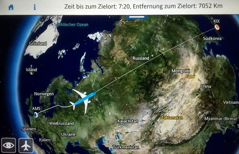 Wir mussten leider noch etwas warten, da die Maschine eine zweistündige Verspätung hatte. Um 13:15 Uhr dortiger Zeit starteten dann auch wir in Richtung Heimat. Wir flogen in den Tag hinein, da Tokushima zu Deutschland eine Zeitdifferenz von +8 Stunden hat.