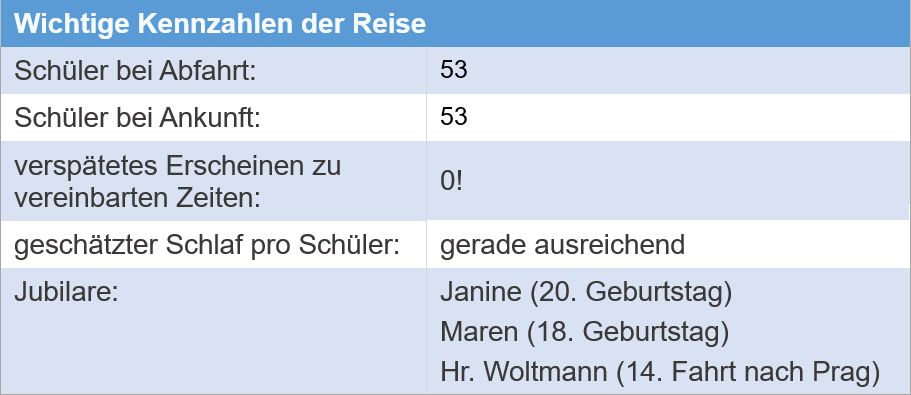 Bereits vor Unterrichtsbeginn fuhren am Morgen des 12.03.2018 die drei Lehrkräfte Kerstin Peters, Oliver Stiepel und Ewald Woltmann mit 15 Industriekaufleuten und 38 Schülerinnen und Schülern der Fachoberschule Wirtschaft und Verwaltung – Schwerpunkt Rechtspflege nach Prag. Nach einer reibungslosen Fahrt erreichte die Reisegruppe am frühen Abend ihr Ziel.