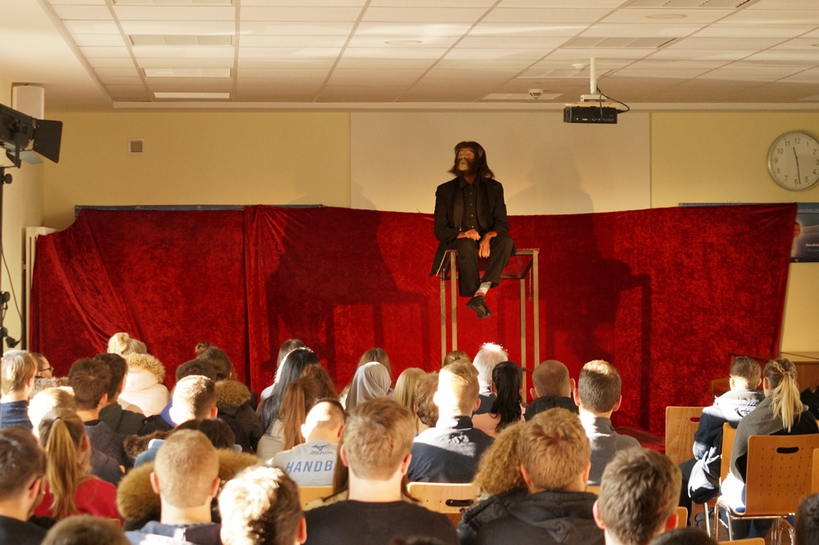 Der Schauspieler Guido Schmitt gastierte mit dem Stück „Ein Bericht für eine Akademie“ von Franz Kafka in der Aula unserer Schule. An der Veranstaltung nahmen die Klassen des 12. Jahrgangs der Fachoberschule – Wirtschaft und Verwaltung – Schwerpunkt Verwaltung und Rechtspflege und die Klasse zwei der zweijährigen Berufsfachschule – Wirtschaft – teil.