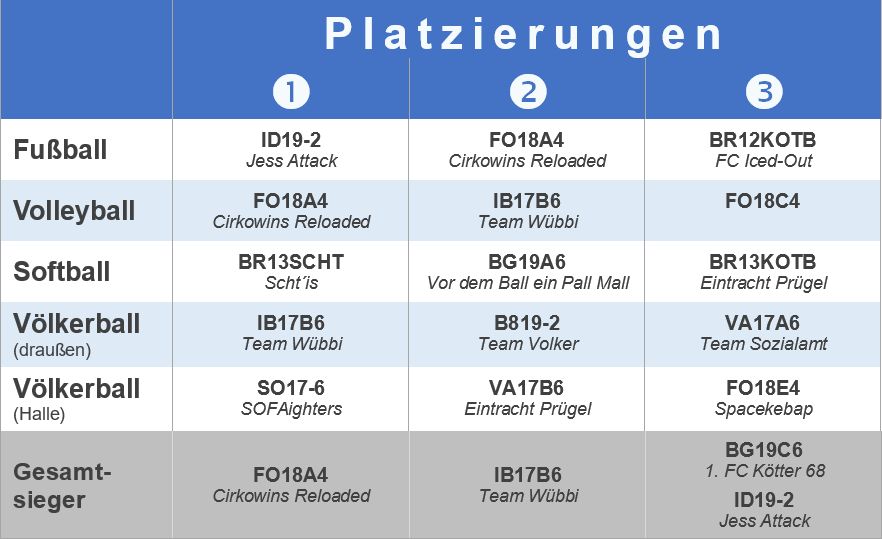 Am 10.09.2019 fand unser diesjähriges Sportfest statt. Wir nutzten die verschiedenen Sportstätten sowie das gesamte Außengelände unserer Schule rund um den Schölerberg, um Sportturniere in den Sportarten Fußball, Volleyball, Softball und Völkerball durchzuführen. Bei jedem Turnier konnten die teilnehmenden Teams für ihre/n Klasse/Kurs Punkte gewinnen. Die meisten Punkte erzielte in diesem Jahr die Klasse FO18A4 (Team „Cirkowins Reloaded“) der Fachoberschule Wirtschaft und Verwaltung, die somit Gesamtsieger wurde.