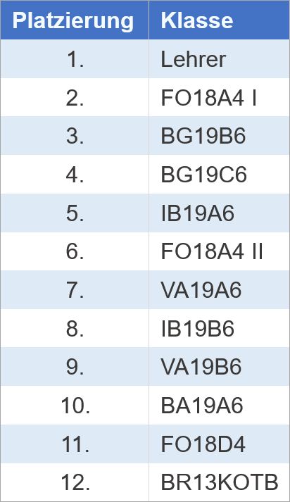 In einem hart umkämpften Finale gewann beim diesjährigen Weihnachts-Volleyballturnier das Lehrerteam gegen die erste Mannschaft der Klasse FO18A4 aus der Fachoberschule. Beide Finalisten setzten sich im Halbfinale gegen Teams aus der Jahrgangsstufe 11 des Beruflichen Gymnasiums durch. Das Spiel um Platz 3, das direkte Duell der beiden elften Klassen, gewann am Ende die BG19B6 (11B). Insgesamt waren alle Spiele des Turniers von hoher Sportlichkeit, von Ehrgeiz und vor allem hoher Fairness geprägt.