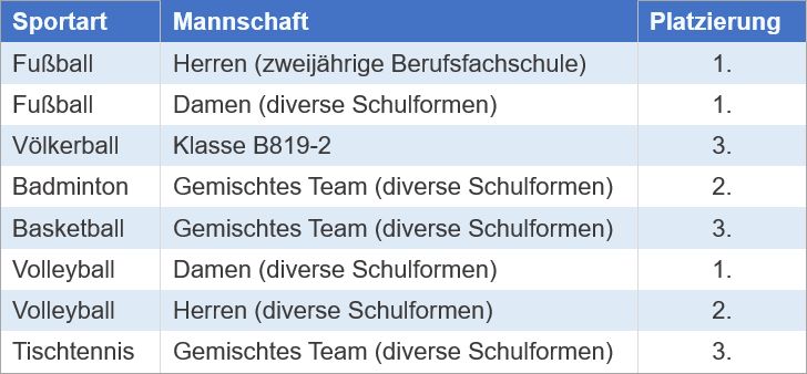 Vielen Dank an alle teilnehmenden Schülerinnen und Schüler und an die betreuenden Sportlehrer für das Engagement und die sportlich fairen Wettkämpfe.