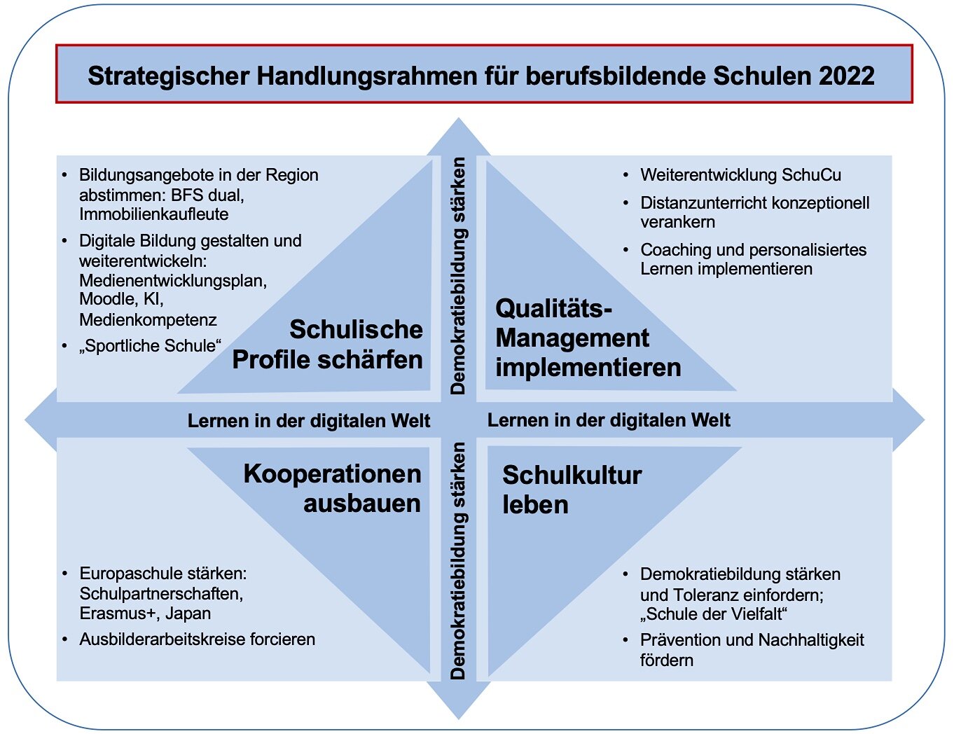 Die BBS am Schölerberg hat ein Qualitätsmanagementsystem-BBS implementiert, das neben dem verbindlichen Kernaufgabenmodell für berufsbildende Schulen (KAM-BBS) 2022 auf dem Strategischen Handlungsrahmen-BBS 2022 (Link) basiert.